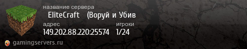 Заходите на классический игровой сервер EliteCraft(Воруй-Убивай). Мы начинали свой путь в 2014 году,на версии 1.7.2 проработав 2 года проект закрылся (за это время на сервер зашло 75000 игроков, средний онлайн держался на уровне 10 человек в день, кому-то может показаться мало,но это было интересно).