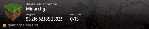 Уважаемые Игроки! Мы создали этот сервер не для нас, а для вас. Мы гарантируем вам комфортную игру без лагов, багов и так далее. Также, на нашем сервере запрещены читы и дюп, поэтому все игроки будут играть в абсолютно одинаковых условиях. Ждём вас на сервере Minarchy! P.S. В связи с открытием сервера, в течении трёх дней, вы можете использовать комманду /tp, которая позволит вам телепортироваться до 100к блоков в обычном мире и до 12к блоков Незере!