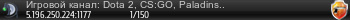 94.154.1.86:9987Игровой канал: Dota 2, CS:GO, Paladins...